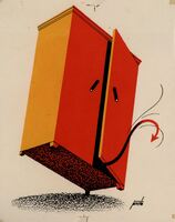 MISS ROVEL La figura que se representa en el dibujo es un armario de color rojo y amarillo en su lateral. El objeto se apoya sobre uno de sus pies y de su puerta entreabierta se despliega el rabo de un diablillo en color rojo. La sombra de la base del armario es de color negra y en toda la imagen se aprecia un gran movimiento.Boceto realizado para la ilustración revista Novelas y Cuentos. Titulo: Miss Rovel. Autor: Víctor Cherbuliez. Nº publc. 1225 Fe cha: 31-10-1954 Tomo NC 41. Prueba Imprenta: 94