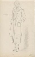 Modelo posando 2 Imagen de una modelo posando de perfil, con un abrigo y sus manos metidas en los bolsillos. Hay algunas anotaciones referentes a los botones, donde se lee marrón y en el abrigo se lee gris.