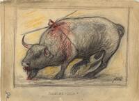Muerte del toro Boceto a lápiz con fondo cuadriculado, de la imagen de un torero frente al toro que cae desplomado a la arena del ruedo con apuntes a lápiz del título. Los sombreros tirados al ruedo nos hablan del éxito de la faena.