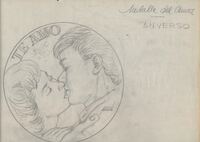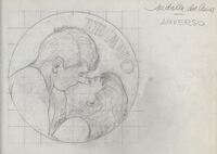 Anverso de la medalla del amor Boceto a lápiz del anverso de la medalla del amor, que representa los perfiles de un hombre y una mujer, con un look un tanto años 70, besándose junto a las letras “Te amo.”Para Numismatica Iberica