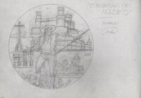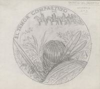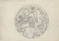 Anverso de la medalla La Bronca Boceto a lápiz del anverso de la medalla La Bronca, con la imagen de dos hombre luchando en aptitud de lucha y ataque, donde uno de ellos sostiene un arma blanca junto a la figura de un gallo.Boceto realizado para un a futura medalla titulada"LA BRONCA" anverso. Sin más referencias