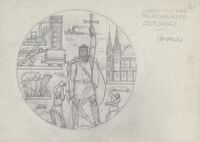 Anverso de la medalla del País Vasco Boceto a lápiz de la medalla conmemorativa de la Comunidad Vasca, donde en primer término se aprecia la figura de Pío Baroja rodeado de imágenes y elementos significativos de la región.