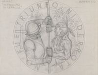 Anverso de la medalla Ni triunfo ni derrota Boceto a lápiz del anverso de la medalla titulada “Ni triunfo ni derrota”, que son las letras que se leen en el perfil de la medalla, con la imagen en primer término de un soldado y un indio de perfil y enfrentados que sostienen la misma lanza haciendo fuerza uno contra otro, como si ninguno estuviese dispuesto a renunciar a ninguno de los objetivos defendidos por ambas partes.Presentada para el concurso de Barcelona de Isidro Cistare. Primer Premio Otros Archivos: MBR/1475.