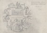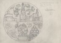 Anverso de la medalla de la Comunidad de La Rioja Boceto a lápiz del anverso de la medalla conmemorativa de la Comunidad de LaRioja con elementos, bodegas y símbolos característico de la región: en uno de ellos, la vendimia de forma tradicional.