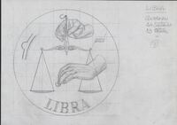 Anverso Libra Boceto a lápiz del anverso de la medalla correspondiente al signo libra, representado por la balanza con una mano sujetando el travesaño de la balanza y la otra depositando una moneda para junto a la medalla anotaciones a lápiz del autor.
