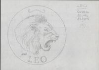 Anverso Leo Boceto a lápiz del anverso de la medalla correspondiente al signo leo representado por la cabeza de un león, que abre su gran boca con un rugido junto a la medalla anotaciones a lápiz del autor.