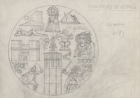 Anverso de la medalla de la Comunidad de Castilla León Boceto a lápiz de la medalla conmemorativa del anverso de la medalla de la Comunidad de Castilla León con iconografía significativa de la comunidad, distribuidos geométricamente.
