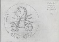 Anverso Escorpio Boceto a lápiz del anverso de la medalla correspondiente al signo Escorpio, representado por la imagen de un escorpión junto a la medalla anotaciones a lápiz del autor.