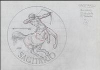 Anverso Sagitario Boceto a lápiz del anverso de la medalla correspondiente al signo sagitario, representado por un centauro mitad hombre mitad caballo practicando el tiro al arco, junto a la medalla anotaciones a lápiz del autor.