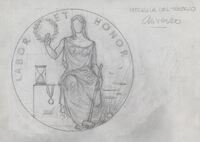 Anverso de la medalla del trabajo Boceto a lápiz del anverso de la medalla conmemorativa al trabajo, con la imagen de una mujer sentada que sujeta en una de sus manos una corona de laurel y en la otra una maza, en el podio donde está sentada cuelga una medalla junto a un reloj de arena, en el perfil de la medalla inscrito se lee las letras “Labora et Honor.”Para Numismática Iberica. Otros Archivos.: MEN/1650 MBR/ nos falta la medalla