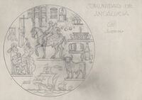 Anverso de la medalla de la Comunidad Andaluza Boceto a lápiz de la medalla conmemorativa de la Comunidad Andaluza, en cuyo centro una pareja vestidos con trajes típicos andaluces, a caballo, rodeado por elementos de la gastronomía significativos de la región.