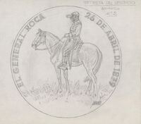 Anverso de la medalla del General Roca - Serie retreta del desierto Boceto a lápiz del anverso de la medalla Retreta del desierto, con la figura de un militar del siglo XIX a caballo junto a las letras inscritas en el perfil “El general roca, 26 de Abril 1879”.Sin referencias