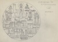 Anverso de la medalla de la Comunidad Extremeña Boceto a lápiz del anverso de la medalla de la Comunidad Extremeña con elementos arquitectónicos y elementos típicos y significativos de la comunidad, como algunos bailes regionales.