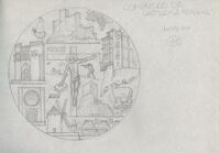 Anverso de la medalla de la Comunidad de Madrid Boceto a lápiz de la medalla conmemorativa del la Comunidad de Madrid, donde se aprecia numerosos monumentos arquitectónicos significativos de la Comunidad, como la fuente de Cibeles.