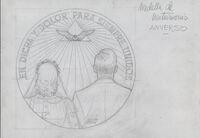 Anverso de la medalla del Matrimonio Boceto a lápiz del anverso de la medalla del matrimonio, con la imagen de una pareja de novios de espaldas, el día de su boda frente al símbolo que representa a Dios que es un triángulo en cuyo centro se encuentra una paloma con las alas abiertas rodeado por rayos.Para Numismatica Iberica