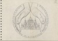 Aplicaciones del aislamiento en la construcción Boceto a lápiz de una de las caras de una medalla para las aplicaciones del aislamiento en la construcción, representado con la imagen de dos manos que cobijan a un monumento arquitectónico icono de un estilo y una época, la silueta del Real Monasterio de San Lorenzo de El Escorial.Para Cristalería Española, SA boceto del reverso de Escuelam Superior de Arquitectura. Otros Archivos: MBO/580 MBR/1476