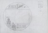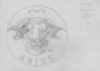 Aries Boceto a lápiz de una medalla con las fechas correspondientes signo del zodiaco con la imagen de las torres de dos edificios, uno de ellos una iglesia, asociando esos meses con la llegada de las cigüeñas.