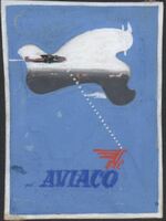 Aviaco Enmarcado este dibujo se ha representado bajo el lema de “aviaco”, de un azul muy fuerte, un avión metido en una nube con una forma peculiar. El fondo de este dibujo es azul. Una línea de puntos blancos atraviesa el dibujo relacionando el avión con una figura roja que se encuentra por encima del título. El boceto azul de la firma del pintor está presente en la composición.Boceto realizado para AVIACO.