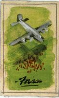 Avión En este dibujo enmarcado y sobre un fondo verde claro se representa a un avión blanco volando. Bajo el avión se vislumbra lo que parece ser su sombra reflejada sobre la que hay pequeñas manchas de color rojo. En la parte inferior destaca una palabra en color negro.