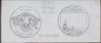 Aries y las cigüeñas Boceto a lápiz de dos caras de unas medallas con diferentes temas pero mismo significado en la relación de fechas, la primera con la imagen de una cabra representado a un signo del zodiaco, y la otra con las siluetas de dos torres de campanario con dos fechas en las que las cigüeñas se posan.