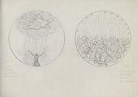 Anverso y reverso de una medalla Boceto a lápiz de las caras de una medalla donde en el anverso se aprecia la imagen de una mano que sale de una nube (Dios) moviendo los hilos de un títere con la figura de un hombre, debajo anotaciones a lápiz del autor donde se lee orden, equilibrio y obediencia, en el reverso una multitud de personas dibujadas de forma esquemática luchando entre sí que representa a los hombres, debajo se lee descontento, desorden, desequilibrio, desobediencia.Boceto estudio para una medalla. Sin referencias.