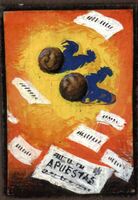 Apuestas Cartel alusivo a la suerte del juego, en primer término un papel en blanco que así lo dice, y en el centro de la escena dos balones cuyas sombras son dos figuras de dos gallos en azules.