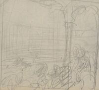 Apunte de una perspectiva Primer boceto a lápiz, de una perspectiva de un arco sobre una columna desde donde se observa una panorámica del ruedo y las cabezas de los espectadores. Es posible que sea un estudio para una medalla.