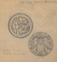 Banco Hispánico Americano Dibujo a color de una medalla, en el anverso la imagen de la composición de dos cabezas de mujer de perfil rodeadas por la leyenda característica, junto a ella el reverso con la imagen de una corona de laurel en cuya abertura superior está la letra A.Realizada por encargo del BancoHispano Americano. Boceto presentado al cliente para su aprobación. Otros Archivos relacionados: MB/. 1440