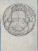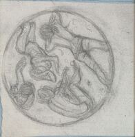 Bebiendo leche Boceto a lápiz de una medalla que representa la escena de una mujer desnuda tumbada sobre la hierba mientras bebe leche directamente de la ubre de una vaca, y otra lejana compañera corre, en la lejanía, detrás de una mariposa.