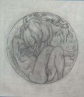 Baños de Sol Primer boceto de una de las caras de una medalla, donde se aprecia el dibujo de una mujer corpulenta de espaldas con un gran sombrero disfrutando del sol. El trasero y las piernas modelan la medalla por la parte baja.