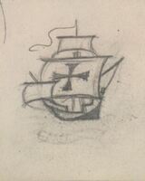 Barco Primer boceto a lápiz de un barco en cuya vela mayor se aprecia el dibujo de una gran cruz. Es una primera aproximación para los barquitos que aparecen en las medallas acerca de la Conquista.Otro estudio. Sin referencias