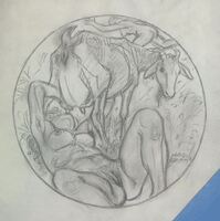 Bebiendo leche 2 Boceto a lápiz de una medalla que representa la escena de una mujer desnuda tumbada, sobre la hierba mientras bebe leche directamente de la ubre de una vaca. La escena nos retrotrae a un mundo como primitivo.