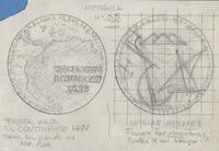 Boceto de la medalla nº 22 para la serie del V Centenario del Descubrimiento de América Boceto de las caras de la medalla número 22, Tercer viaje el continente 1498, en cuyo anverso la silueta geográfica del continente junto al rótulo de da nombre a la medalla, en el reverso el dibujo de un mástil con la vela de un barco y la silueta de una isla montañosa al fondo, debajo a lápiz “Antillas Menores…..”.Bosquejo de la serie del V Centenario… realizado para Numismatica Iberica OTROS ARCHIVOS: MBO/475+476 MBR/1364