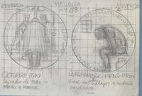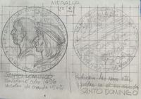 Boceto de la medalla nº 21 serie del V Centenario del descubrimientode América "Fundación de Santo Domingo" Boceto de las caras de la medalla número 21 con anotaciones a lápiz correspondientes a cada cara de la medalla, en cuyo anverso se aprecian los perfiles de Bartolomé Colón y Nicolás Ovando y en el reverso un primer boceto de la ciudad de Santo Domingo.Bosquejo de la serie del V Centenario… la nº 21 realizada para Numismatica Iberica. OTROS ARCHIVOS: MBO/416+473+474 MBR/1361