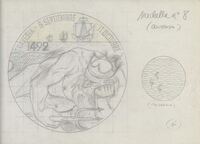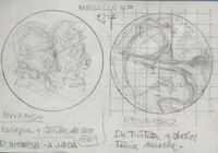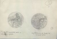 Boceto de la medalla nº 8 serie V Centenario del Descubrimiento de América Boceto a lápiz sobre fondo claro de las caras que conforman la medalla número ocho, en el anverso en primer término el dios Neptuno con tridente y corona tumbado sobre la arena apoyando su cabeza en una de sus manos y de fondo la silueta de varias naves acercándose junto a las letras “travesía 6 de Septiembre y 11 Octubre de 1492”, al lado el dibujo del anverso de menor tamaño difícil de describir por ser un boceto sin definir.Realizada para Numismatica Iberica, anverso y reverso. OTROS ARCHIVOS: MBR/1338 MBO/400+444