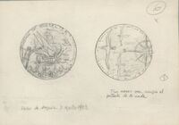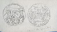 Boceto de la medalla Joseph Trueta, reverso Boceto a lápiz del anverso y reverso de una medalla con bastantes apuntes del autor. Falta la fotografía del perfil de Joseph Trueta que aparece en otras ocasiones. Es posible que este sea uno de los primeros estudios de esta composición.Estudio de futura medalla sobre JOSEPH TRUETA OTROS ARCHIVOS: