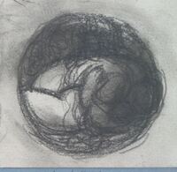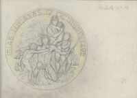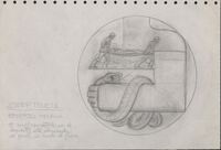 Boceto de la medalla Joseph Trueta 2 Boceto a lápiz de la una cara de la medalla a Joseph Trueta con la imagen de una serpiente enrollada en el brazo izdo. Escayolado aprciando la silueta del torso, con la imagen de fondo de dos soldados camilleros trasportando a un herido. Un estudio del reverso de la medalla de Joseph Trueta?