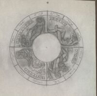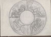 Boceto de la medalla signos del zodiaco reverso Boceto a lápiz de una de las caras de una medalla que representa las cuatro estaciones del año, aquí el autor no especifica si corresponde al reverso o anverso de la medalla, divida en secciones alrededor de un círculo central en blanco y alrededor de toda la composición se aprecia un perfil donde se representa los iconos de cada signo del zodiaco.bocetosobre signos del zodiaco que no llegó a ser realizado. ME/Dib 321+323+324+326 Otros archivos: NO