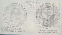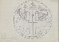 Boceto de la medalla, Bartolomé Colón y Nicolás Ovando Boceto a lápiz de una de las caras de una medalla, donde se aprecia una gran cruz central con una espada dibujada en su centro, en cuyos espacios se aprecia los retratos enfrentados de Bartolomé Colón y Nicolás Ovando y los bocetos de un conjunto de casas y las siluetas de unos barcos.Sin referencias. Posible estudio para la serie del V centenario del descubrimiebnto de América.