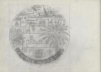 Boceto de la medalla Palos de Moguer Boceto a lápiz de una medalla conmemorativa de Palos de Moguer, en primer término dos palmeras laterales que dejan entre ver los edificios y casa del puerto, en la parte inferior las letras del nombre del puerto.Sin referencias posible estudio para el V centenario del descubrimiento de América.