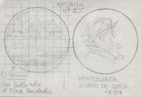 Boceto de la medalla nº 25 serie del V Centenario del descubrimientlo de América "Exploración de Venezuela" Boceto de las caras de la medalla número 25 con anotaciones a lápiz correspondientes a cada cara de la medalla, en cuyo anverso se aprecian el perfil de Alonso de Ojeda y en el reverso el dibujo de un pueblo fundado sobre el agua.Bosquejo de la serie del V Centenario la nº 25 realizada para Numismatica Iberica _Este boceto no es el definitivo, fue modificado OTROS ARCHIVOS MBO/390+482+483 MBR/1339