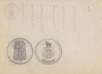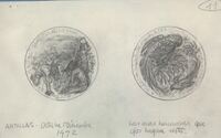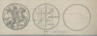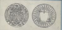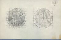Boceto de una medalla Primeros bocetos a lápiz de las caras de una medalla con diferente temática posiblemente relacionadas entre sí, donde se aprecia una balanza y a su lado un escudo representativo del tema que se conmemora.