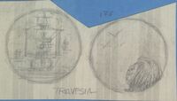 Boceto de una medalla estudiospara el V Centenario del descubrimiento de América Boceto a lápiz del anverso y reverso de una medalla donde se puede apreciar la silueta de un edificio y la cabeza de un león mirando a unos pájaros que cruzan el cielo, debajo de las caras de la medalla una anotación a lápiz en la que se lee “Travesía”.Para Numismatica Iberica surgiendo ideas…