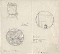 Boceto de una medalla conmemorativa de Renfe, anverso y reverso Boceto a lápiz del anverso y reverso de la medalla conmemorativa de RENFE, con las imágenes del frente de un vagón sobre unos raíles junto al dibujo de las ruedas metálicas de los vagones y por último la estructura por la que circula un tren.Boceto de medalla del 30 aniversario de Renfe. Estudio de una futura medalla.