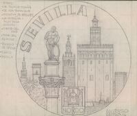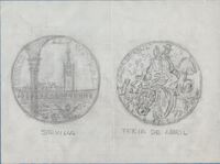 Boceto de una medalla de Sevilla anverso, feria de Abril reverso Boceto a lápiz de las caras de una medalla de Sevilla, en cuyo anverso se aprecia una perspectiva de la plaza de la Maestranza con la silueta de la Giralda al fondo y en el reverso una pareja a caballo vestidos con los trajes típicos de la fiesta sevillana.un boceto estudio sobre Sevilla con su anverso y reverso, no realizados.