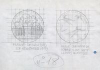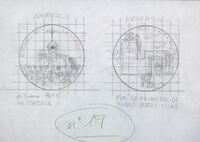 Boceto de una medalla del V Centenartio del descubrimiento de América Boceto a lápiz sobre fondo cuadriculado de las caras de una medalla en cuyo anverso se aprecia una multitud de trazos negros en diferentes direcciones, en el reverso de la medalla el dibujo de un grupo de figuras solo delimitadas por trazos sin ningún detalle.Para Numismatica Iberica medalla del V Centenario del descubrimiento de America la nº 13 "El Regreso" OTROS ARCHIVOS: MBr/1347-MBO/455 y 456