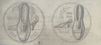 Boceto de una medalla 3 sobre el centenario del zapato? Boceto a lápiz de las caras de una medalla donde se aprecia los dibujos de un juego de zapatos junto a unas ramas de laurel y unas fechas conmemorativas de la que es la tienda que solicita la medalla.Boceto sobre estudio al zapato para conmemorar su centenario?. Sin referencias