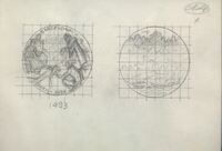 Boceto de una medalla del V Centenario del descubrimiento de América Boceto a lápiz sobre fondo cuadriculado de las caras de una medalla en cuyo anverso se perfilan unas figuras sin definir y en el reverso la silueta de una montaña rodeada por el mar donde se dibujan varios barcos, debajo la anotación a lápiz de 1493.paraNumismatica Iberica "Colon en Barcelona" nº 14 OTROS ARCHIVOS:Mbo/417+457+458 MBR/1346