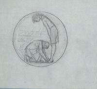 Boceto de una medalla 2 Boceto a lápiz de una de las caras de una medalla donde se aprecia la escena de una mujer de perfil un poco inclinada ante un caballero que le está tomando medidas de sus zapatos.Boceto sobre una medalla parece al zapato. Sin referencias