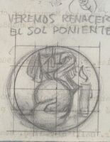 Boceto de una medalla de la serie del V centenario Primer boceto al lápiz sobre fondo cuadriculado de las caras de una medalla titulada “veremos renacer el sol naciente”, donde se aprecia la figura de una mano sujetando una esfera junto a una vela.para Numismatica Iberica. Otros Archivos.:MBO/431 + 395 MBR/1366